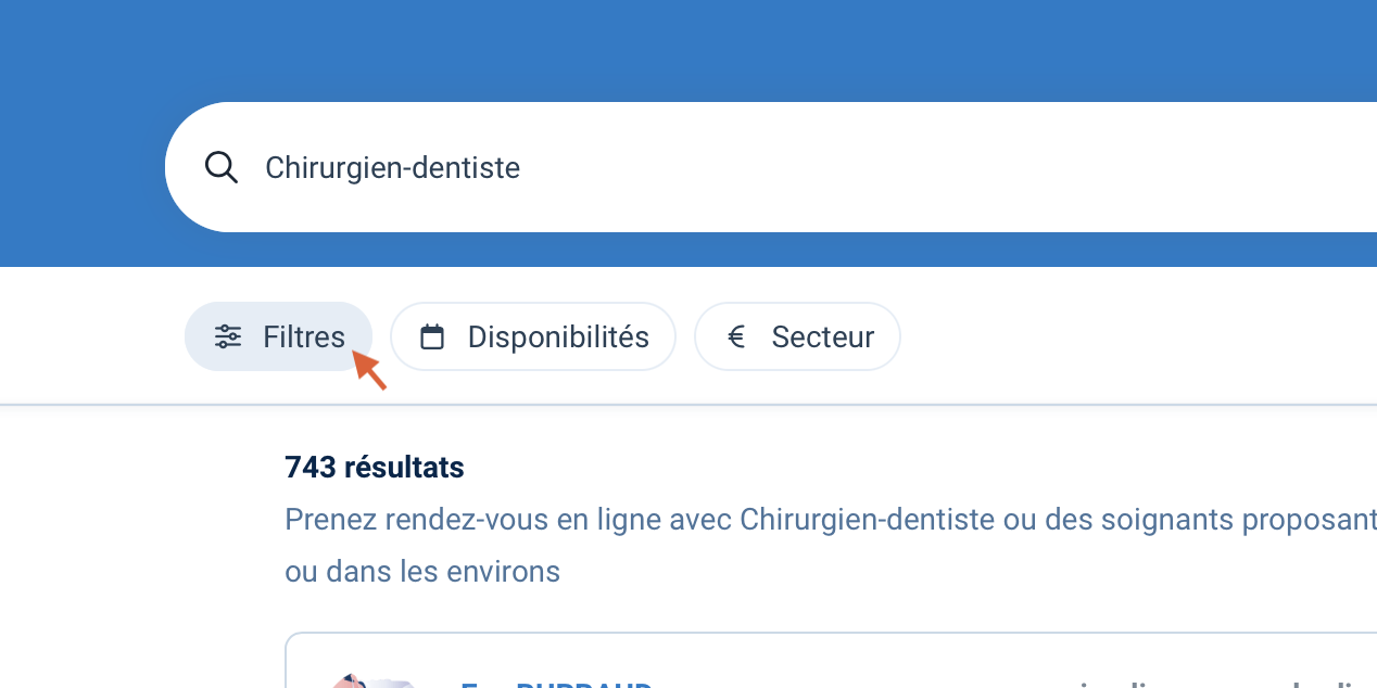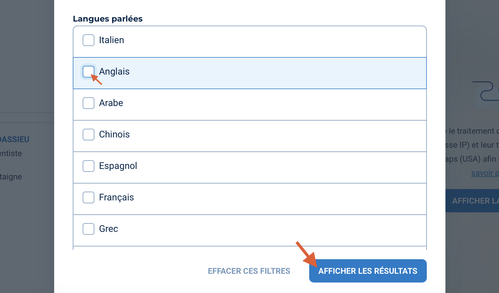 You can filter your search by language to find doctors who speak yours, which is helpful if you don’t speak French fluently. You need to click on “Filtres”, then in the pop-up window look for “Langues parlées” and select your preferred language.