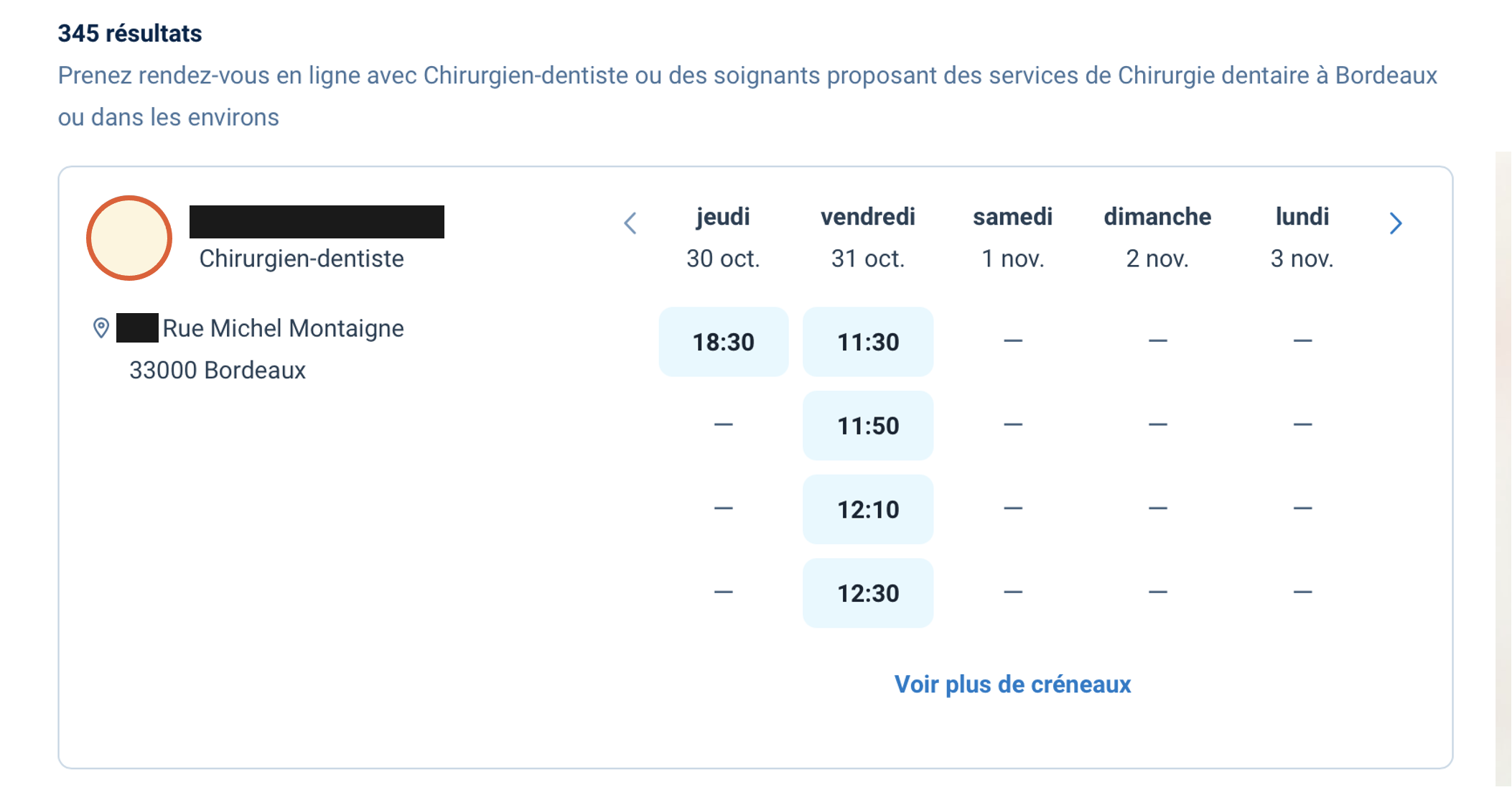 You can also click on the doctor’s name to view all the details you need, then click “Prendre rendez-vous” to see and choose a bit after your preferred time slot.