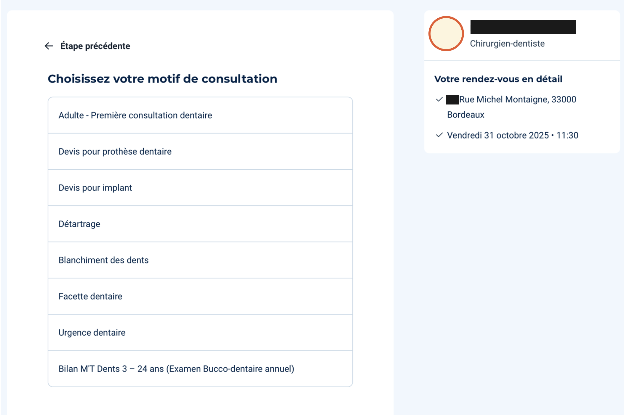 A short questionnaire will appear asking you to “Choisissez votre motif de consultation” (choose your reason for the appointment). Select the option that best fits your situation.