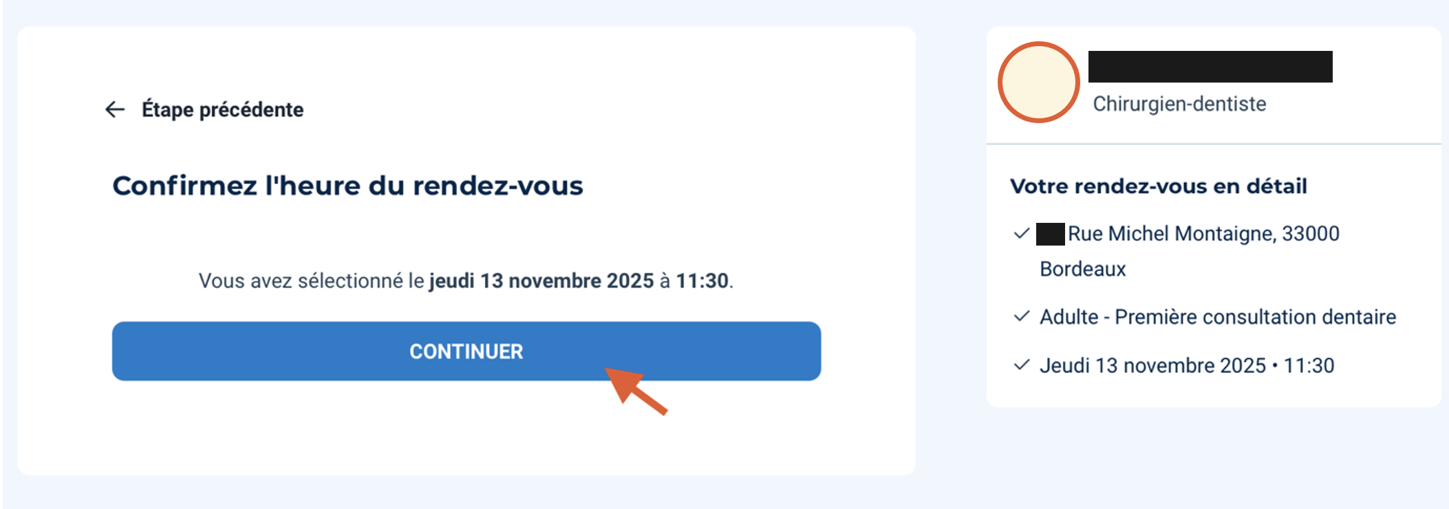 Next, under “Confirmez l’heure du rendez-vous”, check the selected date and click “continuer” to continue your bookind.