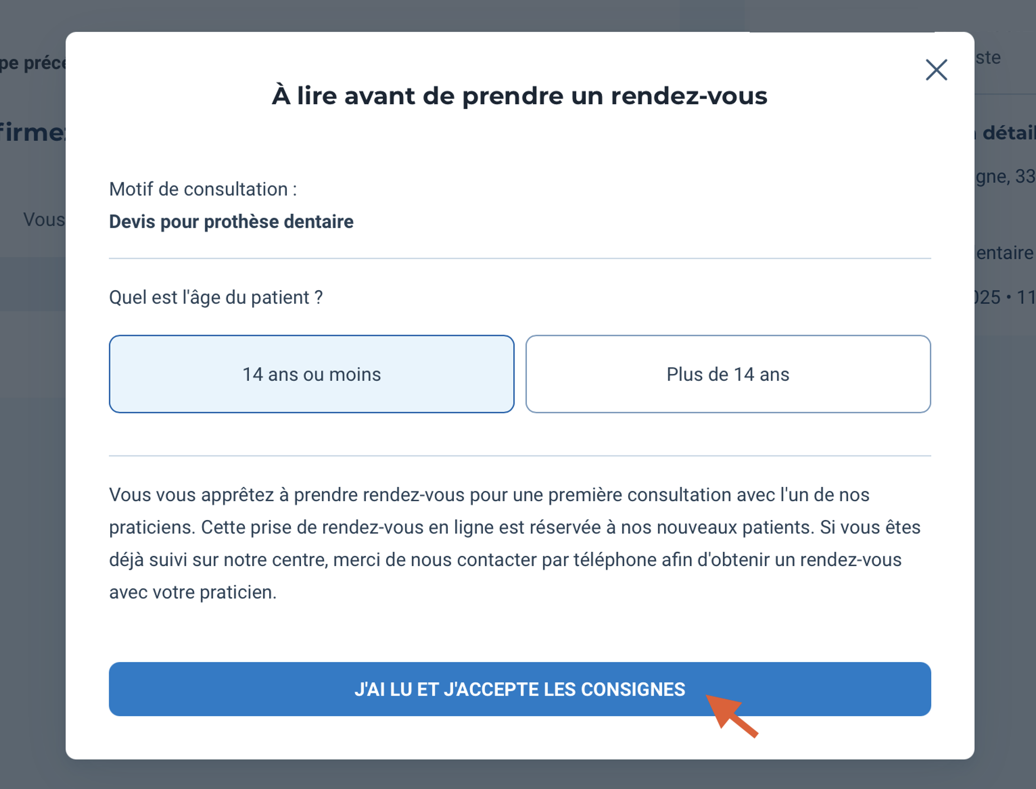 A pop-up window will appear to remind you of your chosen reason for the visit and ask “Quel est l’âge du patient?” (what is the patient’s age?). Choose between “14 ans ou moins” (14 or under) or “Plus de 14 ans” (over 14).